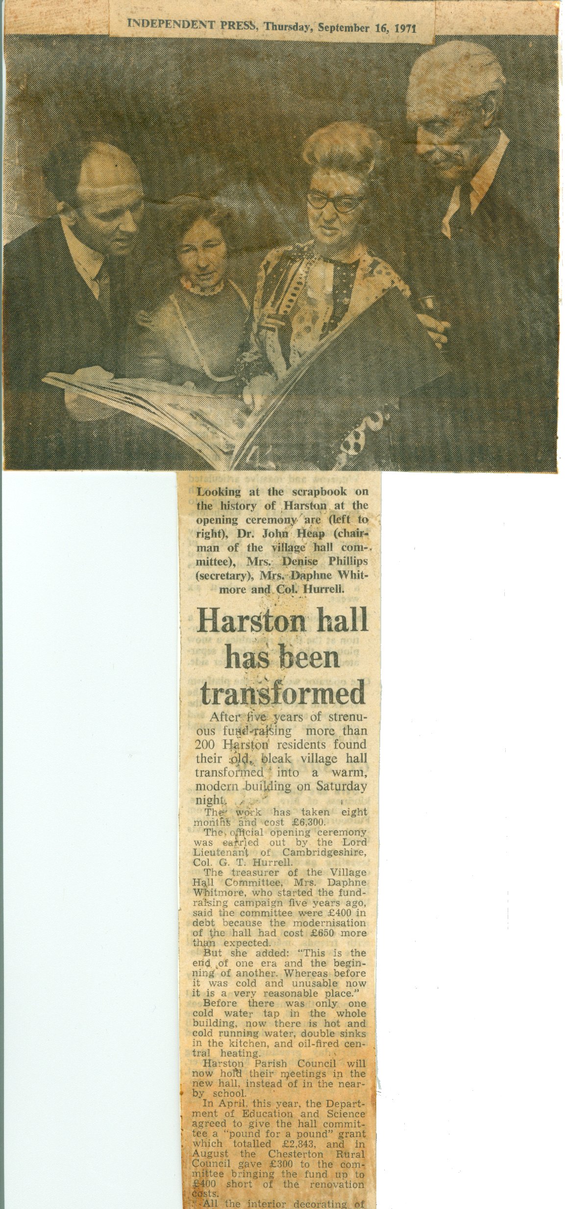 In the late 1960's, fund raising began again together with the sale of land for the building of a Telephone exchange and after 5 years in September 1971 the old bleak village hall was transformed into a warm modern building at a cost of £6300. Whereas before there was only one cold water tap in the building, the modernization included hot and cold running water, central heating and a new kitchen. The official opening ceremony was carried out by the Lord Lieutenant of Cambridgeshire Col. G.T. Hurrell under the watchful eye of Chairman Dr John Heap, Secretary Mrs Denise Phillips and Treasurer Mrs Daphne Whitmore. The Department of Education and Science agreed a pound for pound grant with monies also coming from the Chesterton Rural Council. Fund raising continued apace and in 1973 the Hall celebrated its Golden Jubilee, a week of celebrations took place and a further £9000 was raised to provide a new entrance hall, cloakrooms, flooring and kitchen equipment. The main contractor for these works was Gatward Bros of Harston supported by Tanner & Hall Ltd (roofing) and All Square Flooring Ltd of Newmarket supplied the new maple strip flooring in the main hall. The local paper report can be read here.