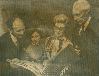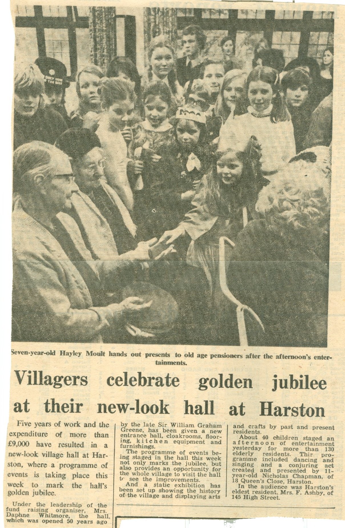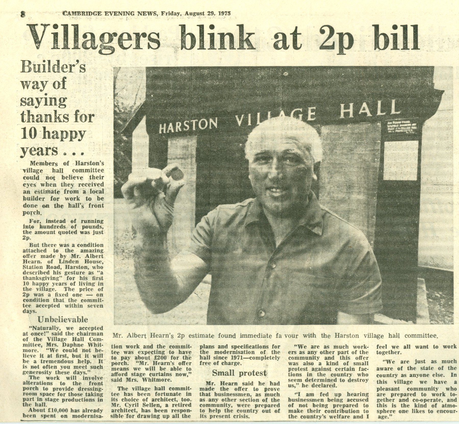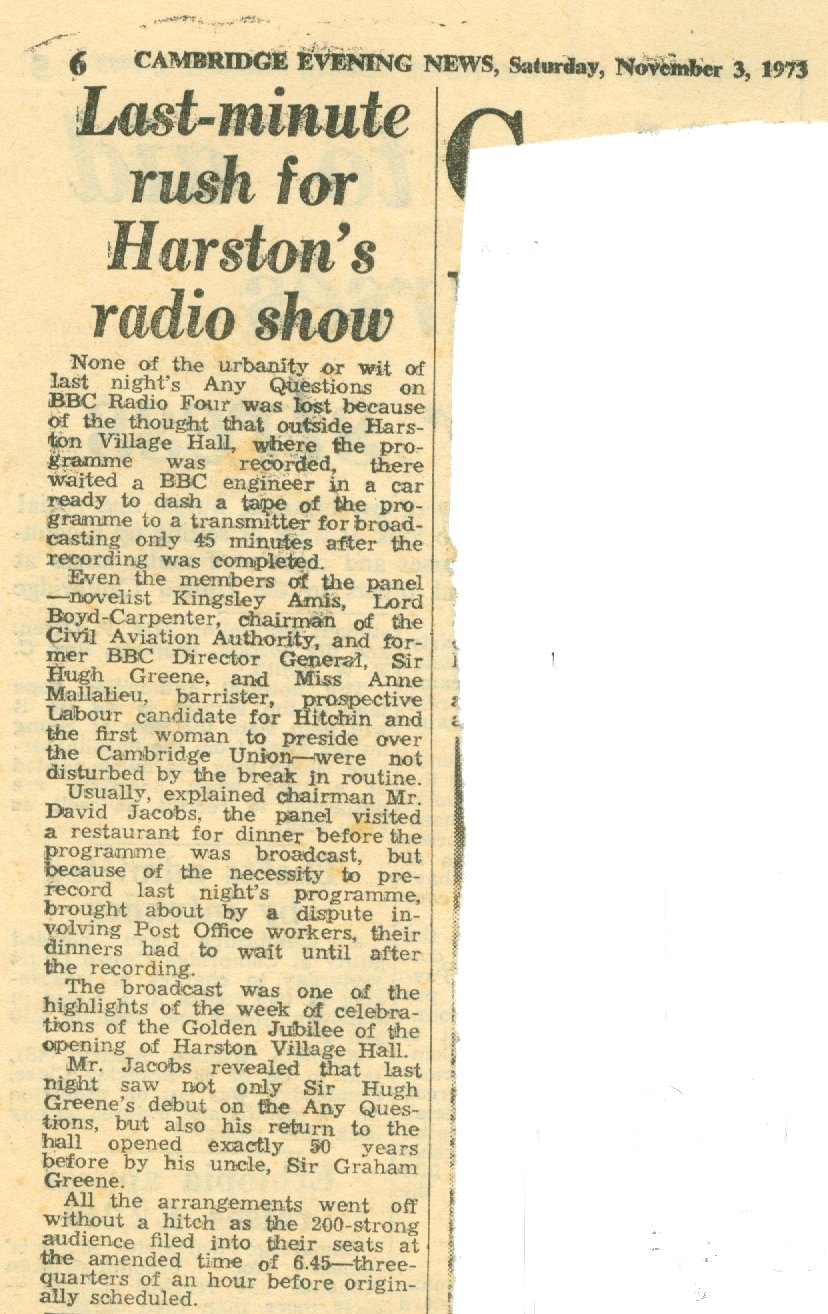 Advertising in the Jubilee Booklet were firms still present today, The Queens Head, Chas Simpkins (mowers) and Barker Bros butchers from Shelford who had advertised in the 1923 programme! There was also an advert from the local car showrooms for Skoda and Moskvich cars, nowadays the village showroom is Aston Martins and Porsche. The week of celebrations started with a Church Service and over the next few days there was entertainment for the senior citizens, Bingo, a Film Show and Concerts with a Gala Dance on the Saturday night. On the previous day ( Friday 2nd November) there was a live broadcast on BBC Radio of the programme 'Any Questions'. The panel included the novelist Kingsley Amis and the former BBC Director General, Sir Hugh Greene whose uncle had opened the Hall 50 years earlier. A report appeared in the Cambridge Evening News which can be seen here. The hall featured again in the Cambridge Evening News when in August 1975 a local Builder Mr Albert Hearn offered to do work on the Halls front porch for a cost of 2p! You can read about his extraordinary offer here.