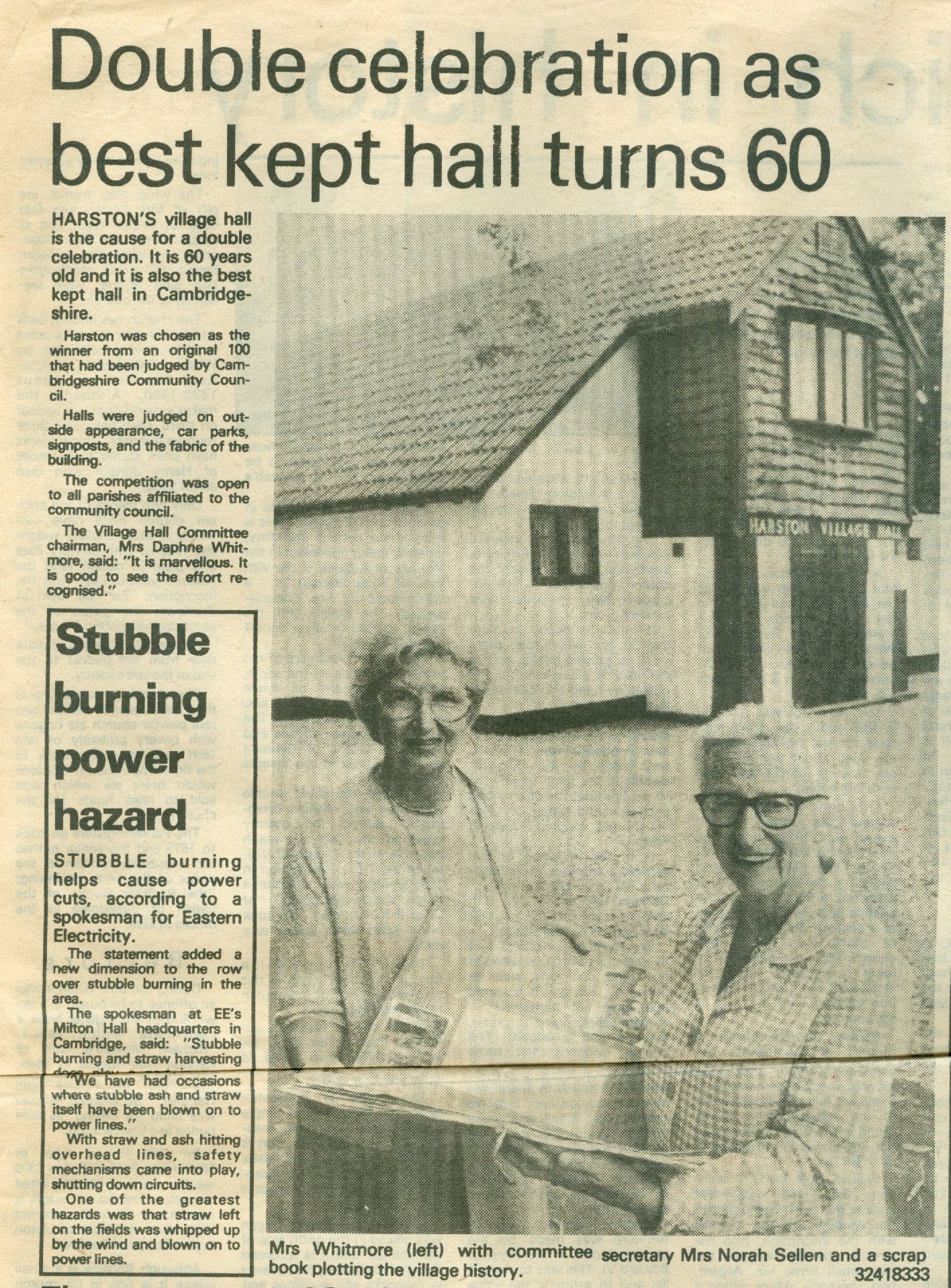 In 1983 the Hall turned 60 and during the year was judged Best Kept Hall in Cambridgeshire out of 100 entries, the event was reported in the Cambridge Weekly News. 1984 saw the retirement of Mrs Daphne Whitmore Chairman of the Trustees.