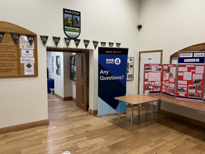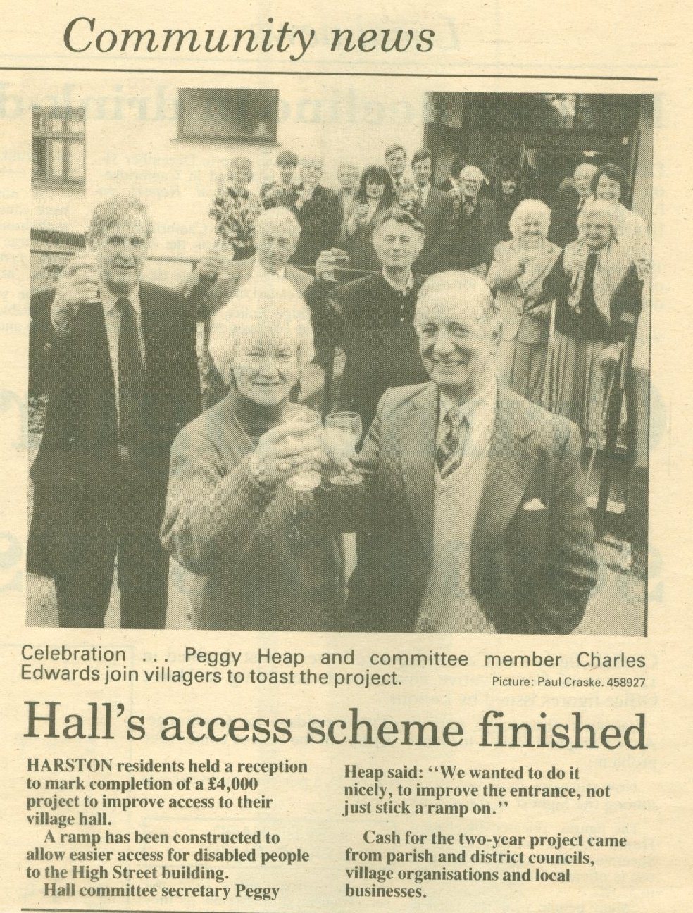 Cambridgeshire District Council. Major donors included: The Opening Ceremony was followed by a reception in the Hall where guests enjoyed refreshments, jazz music played by Harston Church and Friends Music Group, and listened to excerpts from a 1973 recording of the BBC programme "Any Questions", broadcast from the Hall in celebration of its 50th anniversary.