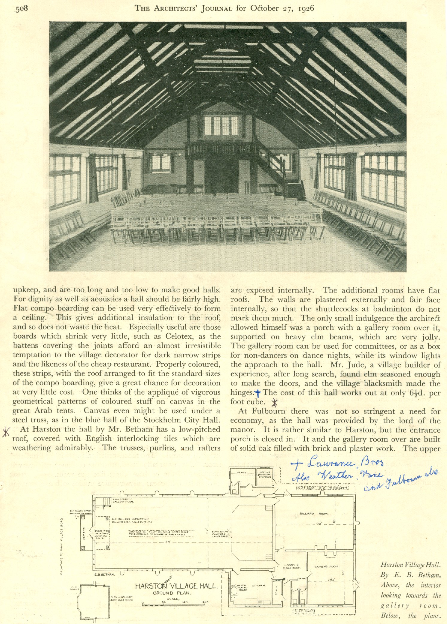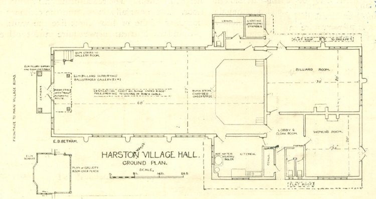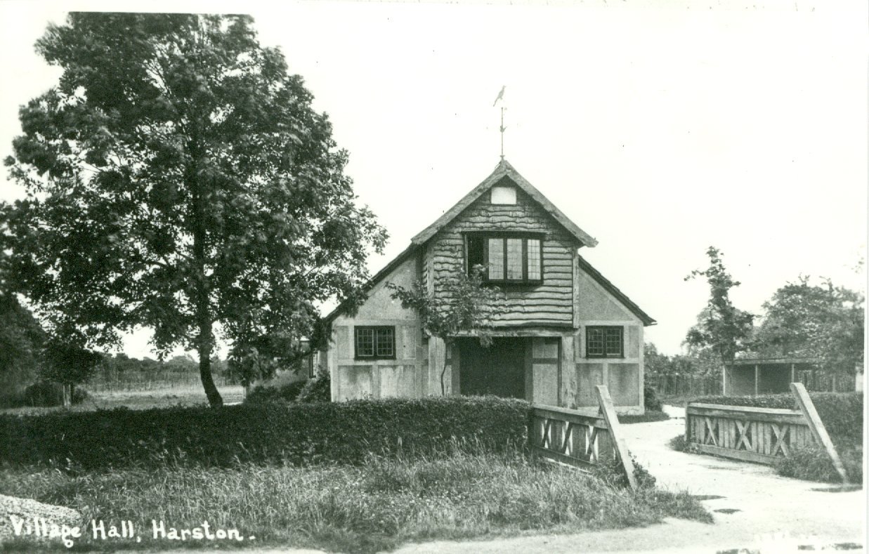 The piece of land upon which the hall was situated had a frontage of 100 feet and a depth of 525 feet and on 27th November 1933 a Declaration of Trust was signed by Sir William Graham Greene, Mr T Harold Smith and Dr W J Young which established the trustees and the document that enables us to run the hall today. The land was vested in the Official Trustee of Charity Lands on 27th July 1937. An article appeared in the 'Architect's Journal' on 27th October 1926 describing how the architect Mr Betham had created a low pitched roof covered with English interlocking tiles, internally the trusses, purlins and rafters were exposed and the doors made of seasoned elm. The main contractor was Mr Clement Jude of Harston with sub contractors Mackintosh and Sons Ltd Cambridge (heating), The Acetylene Corporation Ltd London ( lighting) and Lawrance and Sons, blacksmiths of Harston (ironwork). The total cost of building the Hall and all surrounding site works was £2504. Land on which the hall is built had been owned and farmed from the late 1700's by the Hays family.